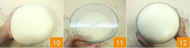 Forme um bloco com a massa 10, coloque o bloco dentro de uma tigela, cubra com filme plástico 11 e deixe crescer em forno desligado com a luz acesa por uma hora ou até que a massa tenha dobrado de volume 12.