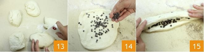 Após esse tempo, divida a massa em 6 pedaços de cerca de 220 g cada 13, estenda os blocos achatando-os levemente com as mãos e recheie com gotas de chocolate 14. Dobre a massa 15