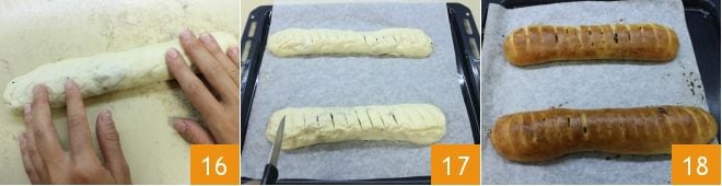 e enrole-a como para formar uma baguete 16, coloque as viennoises em uma assadeira forrada com papel manteiga e deixe crescer por cerca de 1 hora e meia, sempre em forno desligado com a luz acesa. Após esse tempo, bata a gema de ovo com duas colheres de sopa de creme de leite (ou leite) e pincele a superfície das viennoises com essa mistura. Por fim, faça cortes transversais na superfície das viennoises 17 e asse em forno pré-aquecido a 195°C por cerca de 20 minutos ou até ficarem bem douradas na superfície 18 (se em forno ventilado, asse a 185°C por 10-15 minutos). Suas viennoises au chocolat estão prontas, corte em fatias e desfrute no café da manhã com uma boa xícara de café!