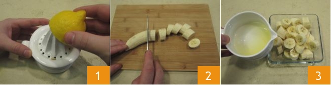 Para preparar a vitamina de banana, comece pegando o limão. Corte-o ao meio e extraia o suco de uma metade 1. Agora pegue uma banana, descasque e corte em rodelas 2. Coloque as rodelas de banana em uma tigela e regue com o suco de meio limão 3.