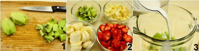 Para preparar a vitamina de frutas, comece descascando o kiwi, depois corte-o em cubinhos eliminando a parte branca central 1. Lave os pêssegos, descasque-os e corte-os em cubinhos. Lave os morangos, retire o talo verde e corte-os ao meio, por último descasque as bananas e corte-as em rodelas 2. Coloque toda a fruta no copo de um liquidificador e adicione o leite. Bata tudo até obter uma mistura lisa e homogênea. Sirva imediatamente!