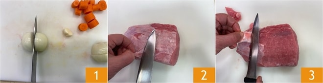 Para preparar o vitello tonnato light, comece limpando e cortando grosseiramente a cenoura e a cebola 1. Remova os tecidos conjuntivos superficiais do vitelo, 2 usando uma faca lisa e tomando cuidado para não remover carne. 3.