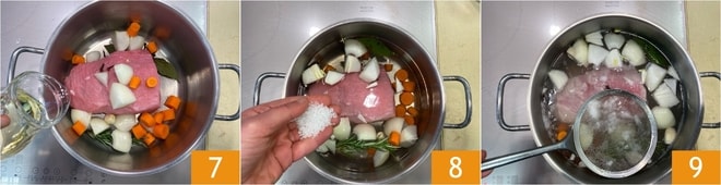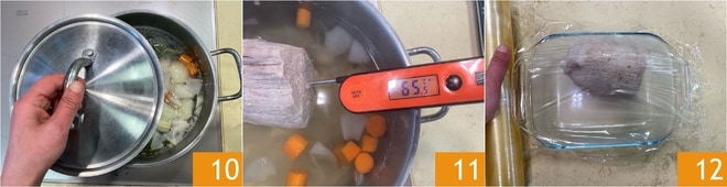 Nesse ponto, tampe a panela 10 e deixe cozinhar em fogo baixo por 30-35 minutos ou até que a carne atinja uma temperatura interna de 65°C 11. Uma vez cozida a carne, escorra e deixe esfriar completamente cobrindo com filme plástico 12.