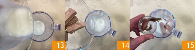 Enquanto isso, prepare o molho de atum light: no copo do liquidificador coloque o iogurte 13 junto com o atum (escorrido) 14 e as anchovas 15.
