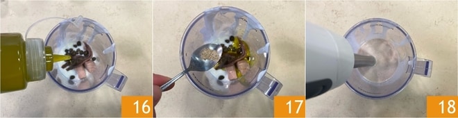 Adicione também as alcaparras, o azeite 16, a pimenta branca 17 e bata até obter um molho fluido 18.