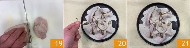 Nesse ponto, você pode fatiar finamente o pedaço de vitelo 19 e servir decorando com o molho e as flores de alcaparra 20. Aqui está o seu vitello tonnato light pronto 21!