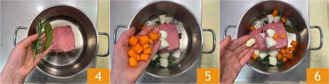 Então coloque o pedaço de carne em uma panela grande com água e tempere com louro, alecrim 4, cebola, cenoura 5, cravos-da-índia e alho 6.