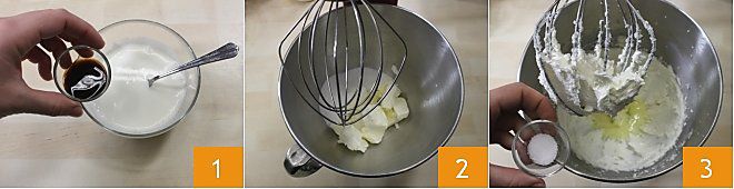 Para preparar os whoopies arco-íris, comece preparando a massa dos docinhos: misture o creme de leite e o extrato de baunilha 1. Na tigela de uma batedeira, ou com as varas de um batedor, bata a manteiga com o açúcar, até obter uma mistura lisa 2. Adicione o ovo, o sal 3 e
