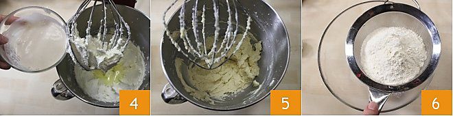 o creme misturado com a baunilha 4 e misture novamente para incorporar os ingredientes 5. Nesta fase, é importante que todos os ingredientes tenham a mesma temperatura, caso contrário, a manteiga ficará imediatamente granulada. Se isso acontecer, não se preocupe: ao adicionar a farinha, que é um estabilizante, tudo ficará homogêneo. Peneire juntos, em uma tigela, a farinha, o amido de milho e o fermento 6.
