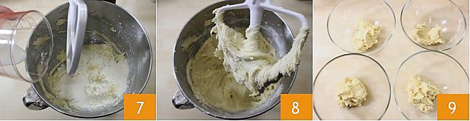 Adicione os ingredientes secos à mistura, alternando com o leite 7 e continue a misturar: você obterá uma massa muito densa, macia e compacta 8. Divida a massa em 4 partes iguais 9: uma parte ficará branca, as outras três serão coloridas.