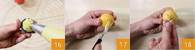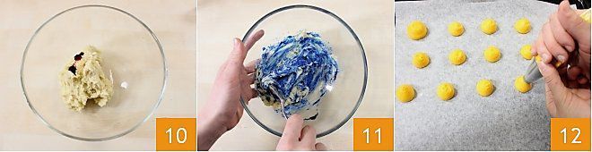 Adicione algumas gotas de corante alimentício nas três partes de massa para colorir 10: você pode escolher a cor que preferir, nós usamos amarelo, vermelho e azul. Comece adicionando pouco corante, depois misture energicamente 11 e, se a coloração não estiver do seu agrado, adicione mais corante, até obter a tonalidade desejada. Transfira a mistura para um saco de confeitar com bico liso e, em uma assadeira coberta com papel manteiga, esprema a massa para formar discos bem altos, com diâmetro de 2 cm 12.