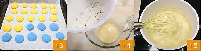 Asse os whoopies em forno estático já aquecido a 180° por 13-14 minutos (se ventilado 160° por 10-12 minutos) 13. Enquanto isso, prepare o creme de confeiteiro seguindo as instruções que Creme de confeiteiro: aqueça o leite em uma panela com metade de uma fava de baunilha e suas sementes; bata em uma tigela, com o batedor, a gema e o açúcar, depois adicione a farinha. Com uma pinça, remova a fava e despeje o leite aquecido na mistura em fio 14, misturando com o batedor. Leve a mistura ao fogo novamente e mexa continuamente até que o creme esteja espesso 15. Transfira o creme de confeiteiro para uma tigela e deixe esfriar, cobrindo com um filme plástico em contato. Retire os whoopies do forno e deixe esfriar em uma grade.