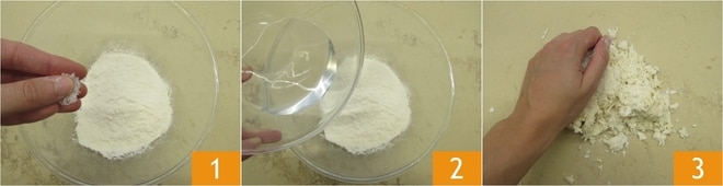Para fazer os wontons fritos, comece pela massa dos raviolis: em uma tigela, coloque a farinha, o sal 1 e a água 2. Misture tudo com as mãos, primeiro na tigela e depois na superfície de trabalho 3.