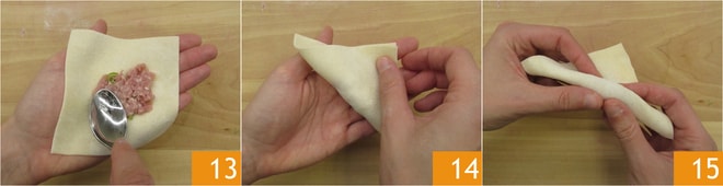 Você está pronto para formar os raviolis: coloque um quadrado de massa na palma da mão e espalhe uma colher de chá de recheio no centro 13, depois dobre o quadrado para formar um triângulo 14. Dobre ainda mais a base do triângulo para selar o recheio dentro, pressionando levemente o recheio com os dedos e cuidando para deixar as bordas livres 15.