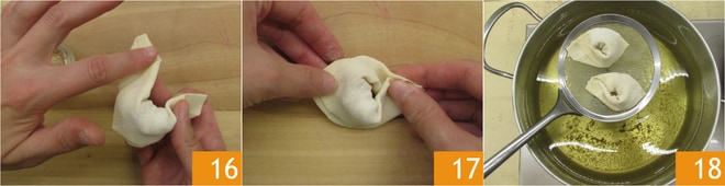 Enrole as 2 extremidades e faça-as coincidir, usando um pouco de água para aderirem bem 16. O primeiro ravioli está pronto 17: prossiga desta maneira para formar todos os outros. Nesse ponto, aqueça o óleo de semente em uma panela até a temperatura de 170°-180° 18 e frite os wontons por cerca de 2 minutos.