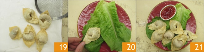 Quando estiverem dourados, escorra em papel absorvente 19. Coloque os wontons fritos sobre folhas de alface 20 e sirva-os acompanhados de molho picante e agridoce 21!