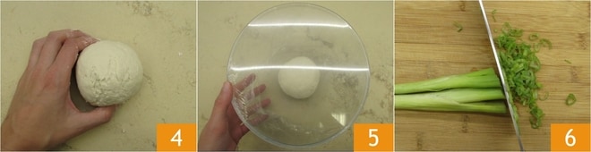 Você deve obter uma massa lisa e homogênea, de consistência bastante dura e compacta 4. Transfira a massa para uma tigela e deixe descansar à temperatura ambiente por cerca de 10 minutos, coberta com filme plástico 5. Enquanto isso, pique a parte verde da cebolinha 6 e dedique-se ao recheio.