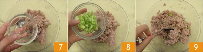 Coloque a carne moída em uma tigela e adicione o vinho de arroz 7, a cebolinha 8, sal e pimenta. Misture com o hashi ou uma colher para incorporar bem o recheio 9.