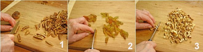 Comece a preparação do zelten com o preparo das frutas secas: corte os figos em tiras 1, a uva malaga ao meio 2 e pique grosseiramente parte das nozes 3.