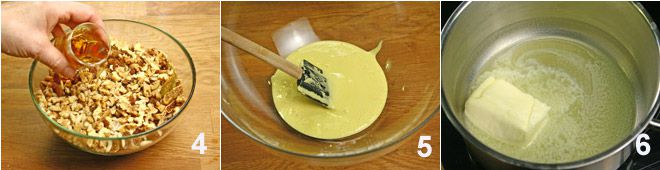 Coloque as frutas assim picadas em uma tigela e acrescente as passas, parte dos pinhões, algumas avelãs e adicione o rum 4. Deixe macerar por cerca de uma hora. Enquanto isso, separe as gemas das claras e bata as gemas com metade do açúcar até que fiquem claras e espumosas 5 e derreta a manteiga em uma panela 6.