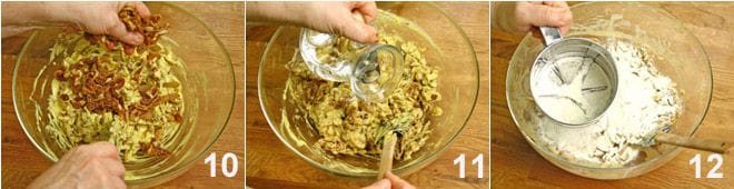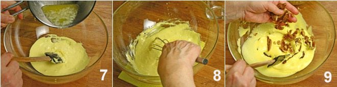 Em seguida, adicione a manteiga derretida aos ovos, misturando bem 8. Em seguida, adicione as frutas secas à mistura, mexendo continuamente 9.