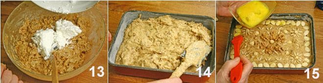 À parte, bata as claras em neve junto com a outra metade do açúcar e incorpore a mistura à massa 13. Pegue uma assadeira retangular (20x25 cm), unte e enfarinhe, despeje a massa e distribua bem com a ajuda de uma espátula 14. Antes de levar ao forno, decore o zelten com amêndoas, pinhões, nozes e avelãs.