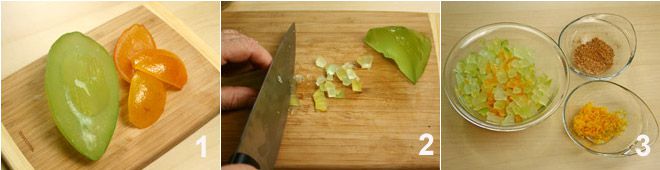 A primeira coisa a fazer para a realização do zelten é a preparação das frutas secas e cristalizadas, ingredientes principais desta receita. Pegue as frutas cristalizadas e corte-as em cubos (1-2). Depois coloque em pequenas tigelas a casca ralada do limão e da laranja, a noz-moscada e a canela 3.