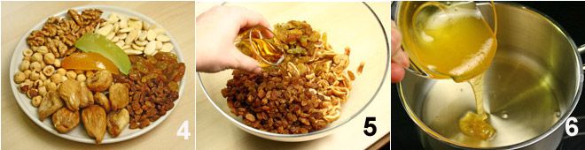 Então, ocupe-se das frutas secas 4. Em uma tigela grande, coloque as passas, as uvas malaga cortadas ao meio e os figos secos sem o talo duro e cortados em tiras 5. Adicione às frutas secas dois copinhos de rum, mexa bem e deixe que as frutas absorvam completamente o líquido 5. Enquanto isso, aqueça e derreta 70g de mel junto com o vinho em uma panela 6.