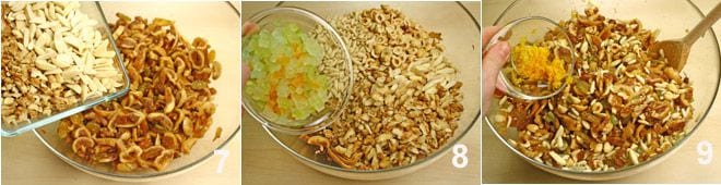 Quando os figos, as passas e as uvas malaga tiverem absorvido o rum, adicione as nozes picadas grosseiramente, as amêndoas cortadas em palitos, as avelãs cortadas ao meio 7, as frutas cristalizadas 8, a casca ralada do limão e da laranja 9, os cravos em pó e o vinho com o mel. Mexa bem para misturar todos os ingredientes. Cubra a tigela com filme plástico e deixe descansar a mistura por pelo menos uma hora (ou até durante a noite, se preferir preparar o zelten em dois dias) para absorver todos os aromas.