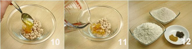 Enquanto isso, em uma pequena tigela, esfarele o cubo de fermento e adicione uma colher de chá de mel 10, cubra com água morna 10, mexa e aguarde que se forme espuma na superfície. Prepare então a farinha de centeio e a de trigo 12.