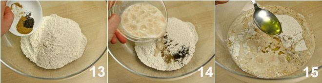 Junte em uma tigela os dois tipos de farinha com o cominho e o anis 13, depois adicione também a mistura de fermento 14 e a colher de sopa de óleo 15.
