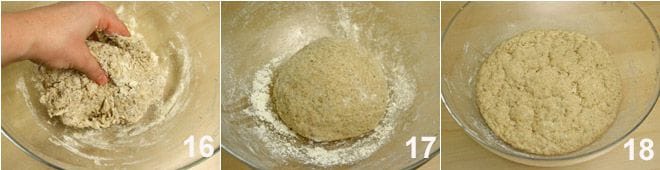 Nesse ponto, amasse tudo até obter uma mistura compacta, macia, mas não pegajosa 17 e deixe-a crescer em um recipiente polvilhado com farinha até dobrar de volume 18.