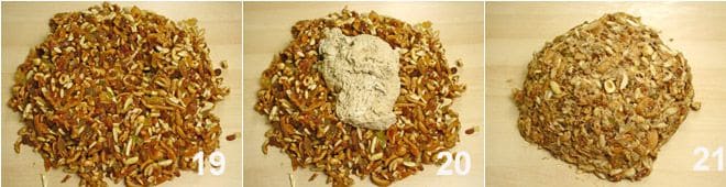 Pegue a tigela com as frutas secas e despeje o conteúdo sobre uma superfície plana 19, coloque a massa por cima 20 e trabalhe bem tudo até obter uma massa homogênea que não se desmanche 21.