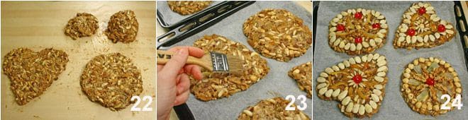 Divida a massa em oito pãezinhos do mesmo peso 22 e molde-os na forma que preferir (redondos, em forma de coração, retangulares, ovais, quadrados), desde que os zelten tenham uma espessura de cerca de 2 cm. Pincele os zelten com uma calda de açúcar ou com mel bem fluido (derreta-o no fogo) 23. Deixe-os descansar e secar por 30 minutos e depois decore-os a gosto com frutas secas e cristalizadas 24. Pincele novamente os zelten com açúcar e leve ao forno a 150/160 graus por 40 minutos. Retire do forno e deixe esfriar seus zelten, depois embrulhe-os em filme plástico e deixe-os descansar por 10-15 dias em um lugar seco antes de consumi-los.