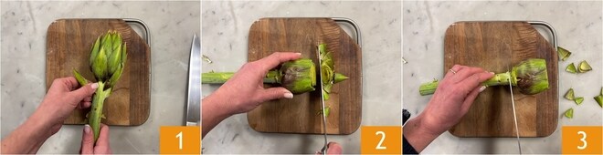 Para preparar as zeppole de alcachofra, a primeira coisa a fazer é limpar as alcachofras. Elimine as folhas mais externas 1, depois com uma faca corte a ponta 2 e corte também o cabo 3.