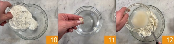 Agora prepare a massa para as zeppole. Despeje a farinha em uma tigela 10. Em outra tigela, dissolva o fermento na água morna 11 e despeje tudo dentro da farinha 12.
