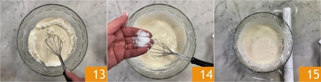 Misture com um batedor de arame 13 até obter uma massa lisa. Por último, acrescente o sal 14 e cubra com filme plástico 15.