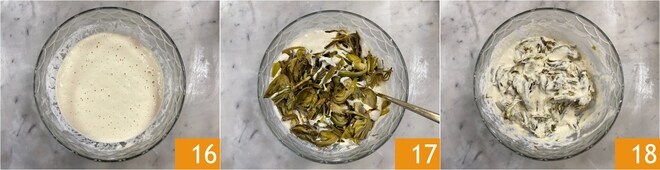 Deixe a massa crescer por uma hora 16. Após este tempo, adicione as alcachofras 17 e misture muito delicadamente 18.
