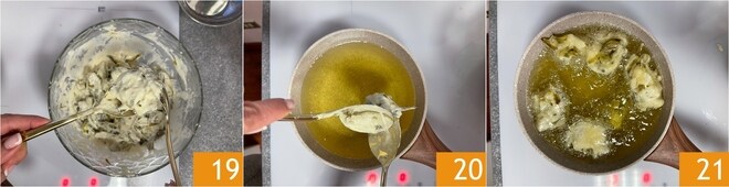 Aqueça bastante óleo de sementes em uma panela de bordas altas, assim que estiver quente, com a ajuda de duas colheres, retire uma quantidade de massa do tamanho de uma noz 19 e deixe escorregar dentro do óleo 20. Mergulhe alguns pedaços de cada vez, para não baixar muito a temperatura do óleo 21.