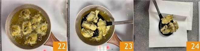 Vire as zeppole de vez em quando até que fiquem bem douradas 22. Escorra-as com uma escumadeira 23, transfira para uma bandeja forrada com papel absorvente para retirar o excesso de óleo 24 e continue assim com o cozimento das outras. Sirva as zeppole de alcachofra ainda quentes!