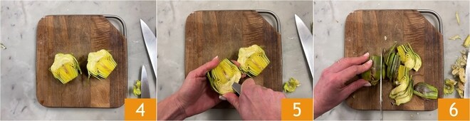 Divida as alcachofras ao meio 4 e com uma faquinha elimine os pelos internos 5. Depois corte-as em fatias finas 6.