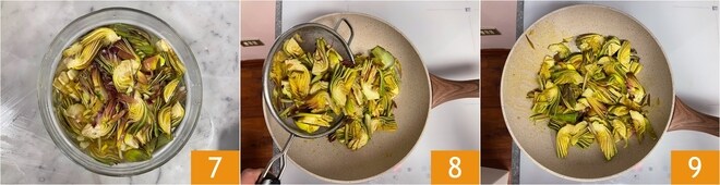 À medida que for cortando, coloque as alcachofras em água com ácido para que não escureçam 7. Despeje um fio de azeite em uma panela e transfira as alcachofras bem escorridas para dentro 8. Salteie em fogo alto por 5 minutos, depois ajuste o sal, abaixe o fogo e cozinhe por mais 5 minutos 9. Deixe esfriar completamente, depois cubra as alcachofras e reserve.
