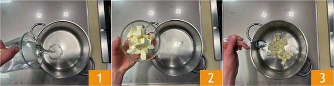 Para preparar as zeppole na fritadeira a ar, comece pela massa choux. Em uma panela, coloque a água 1, a manteiga 2, uma pitada de sal 3 e uma pitada de açúcar. Ligue o fogo e comece a aquecer a mistura.