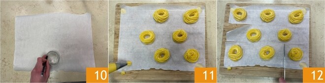 Pegue uma folha de papel manteiga e desenhe círculos de 6 cm, você pode usar um cortador de biscoito para traçar o perímetro com um lápis. Espaçe bem um círculo do outro 10. Vire o papel e forme as zeppole realizando dois círculos de massa choux, um sobre o outro, para cada uma 11. Usando uma faca ou tesoura, corte o papel manteiga ao redor das zeppole 12, para ter cada zeppola em um quadrado de papel e poder levantá-las facilmente.