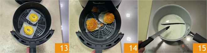 Aqueça a fritadeira a ar a 180°C (usamos uma fritadeira com capacidade de 6 litros), insira duas zeppole 13 e cozinhe por 13 minutos, depois aumente a potência para 200°C e continue cozinhando por mais 12 minutos. Retire as zeppole quando estiverem bem douradas 14, transfira-as para uma grade para esfriar enquanto você cozinha as outras. Enquanto isso, comece a preparar o creme de confeiteiro. Em uma panela, coloque leite, creme de leite, as sementes da fava de baunilha e a fava esvaziada 15.