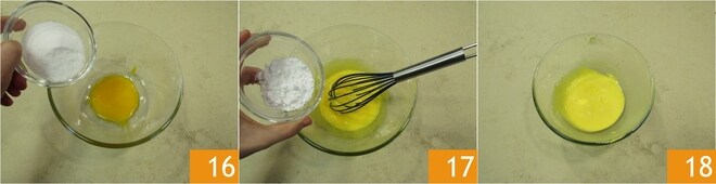 Coloque as gemas em uma tigela, adicione o açúcar 16 e misture com um batedor. Adicione também o amido de milho 17 e misture novamente até obter uma mistura homogênea 18.