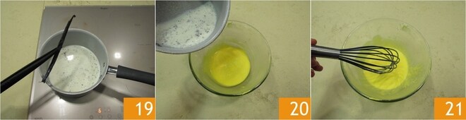 Assim que a mistura de leite e creme de leite estiver fervendo, retire a fava de baunilha 19 e despeje uma parte na mistura de gemas 20; misture para temperá-la 21.