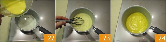 Despeje tudo de volta na panela 22 e misture com um batedor 23 até que o creme engrosse 24 e comece a ferver.