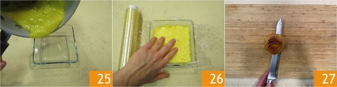 Transfira o creme obtido para uma tigela 25, cubra com filme plástico em contato e deixe esfriar completamente primeiro à temperatura ambiente e depois na geladeira 26. Uma vez frio, transfira o creme para um saco de confeitar com bico estrela de 12 mm. Pegue as zeppole cozidas na fritadeira a ar e corte-as ao meio, como um sanduíche 27.