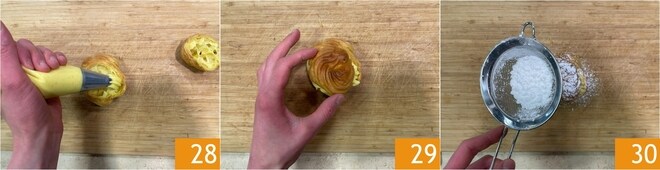 Recheie abundantemente com o creme 28 e feche com a parte superior 29. Polvilhe com açúcar de confeiteiro 30.